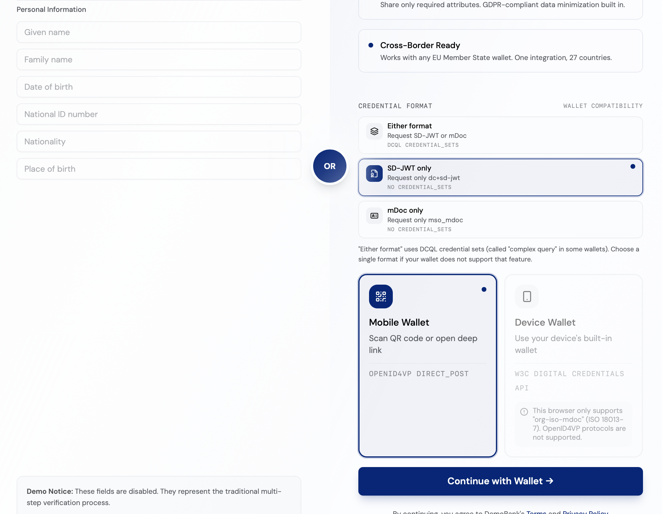 To keep the scope clear: this demonstrator shows practical identity and confirmation journeys in a banking context. It is intended as an implementation reference and learning tool, not as a statement of full production or regulatory completeness for all payment-authentication scenarios.